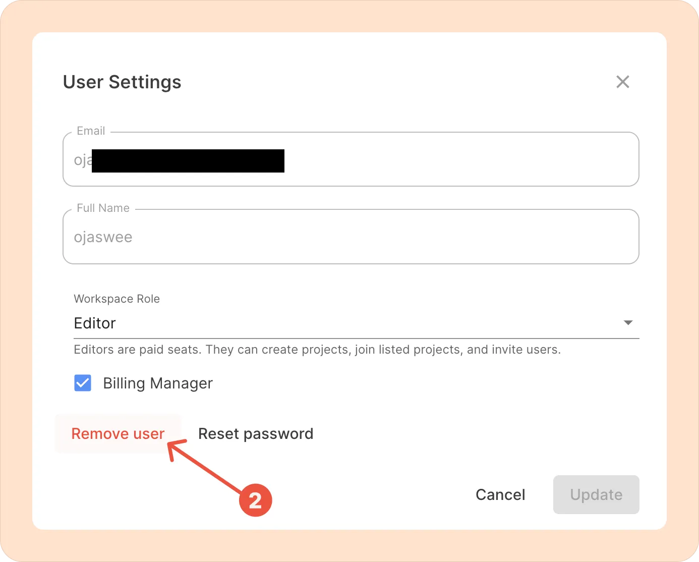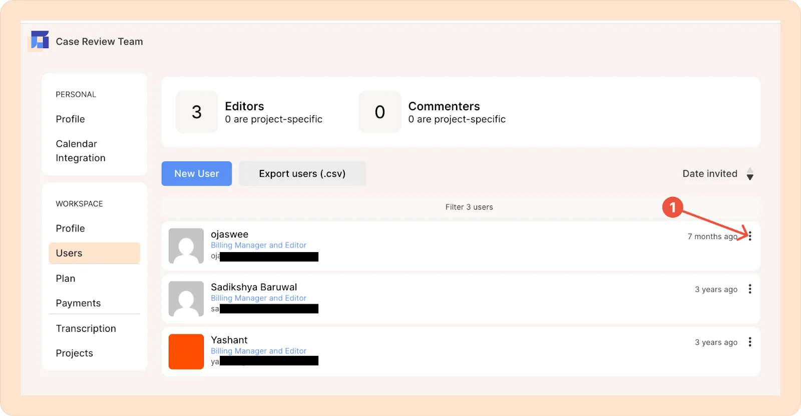 - In the user settings page, click the three-dot kebab menu (︙) next to the user you'd like to remove from the workspace.