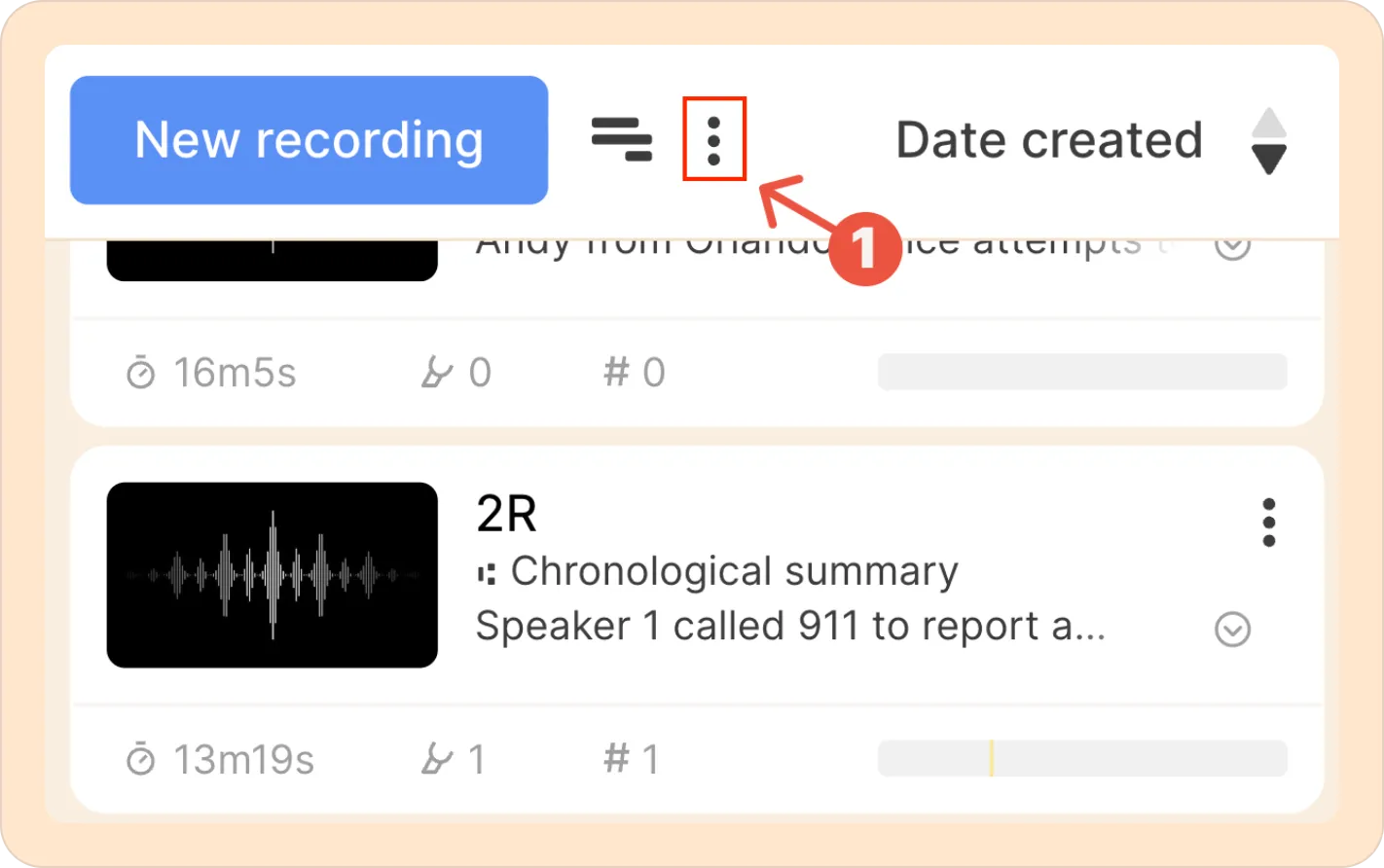 - First, click the three-dot kebab menu (︙) besides the new recording button.