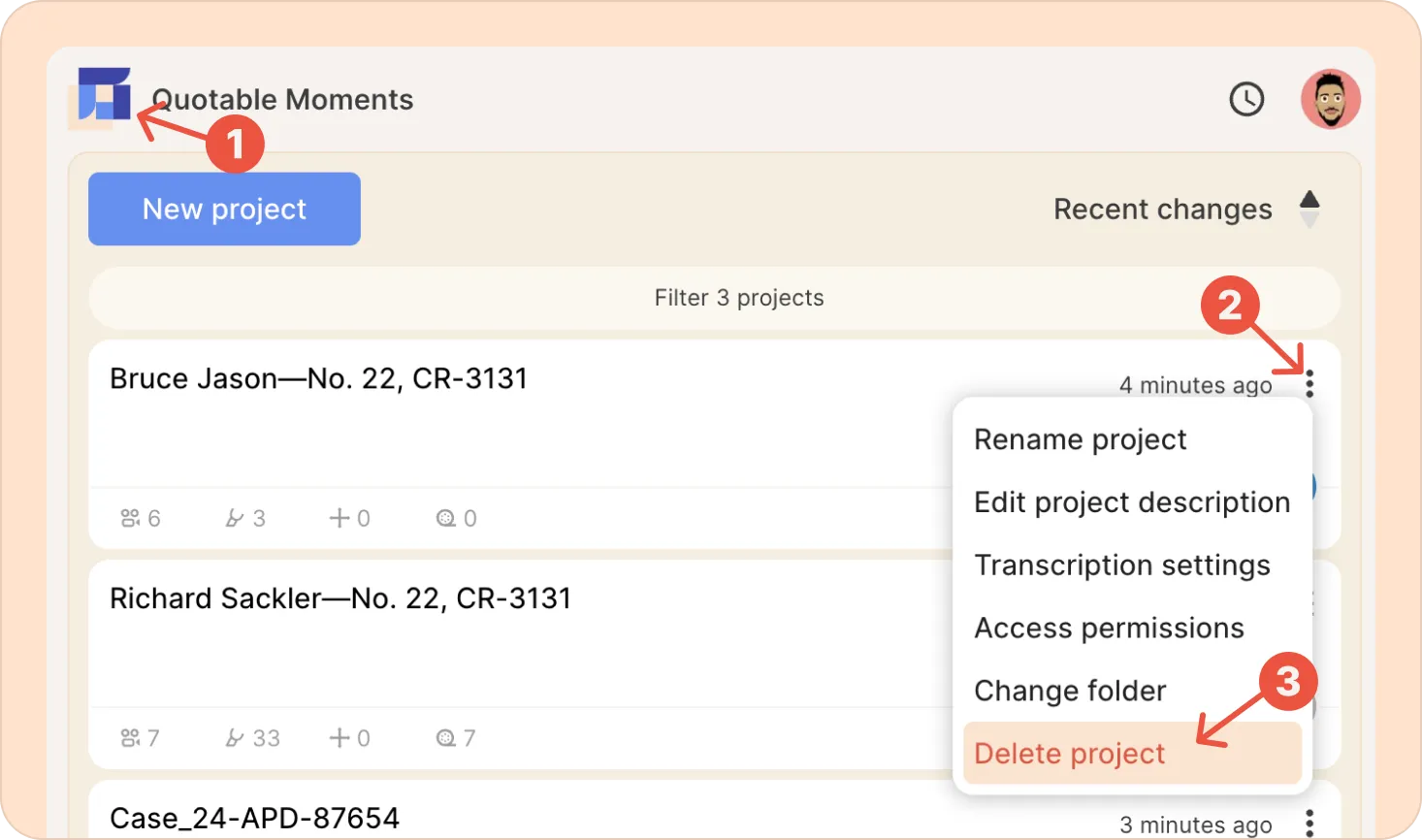 - Go to the projects listing page by clicking on the Reduct logo and locate the project that you want to delete.
