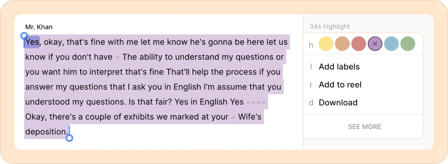 - Click and drag on the transcript to select the text - and thus time range - you want to highlight.