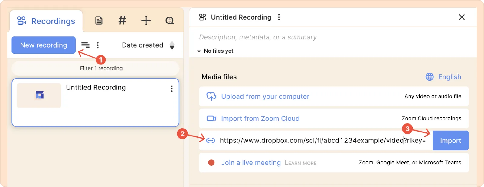 - Click the New recording button in Reduct and select Import from a web link text box.