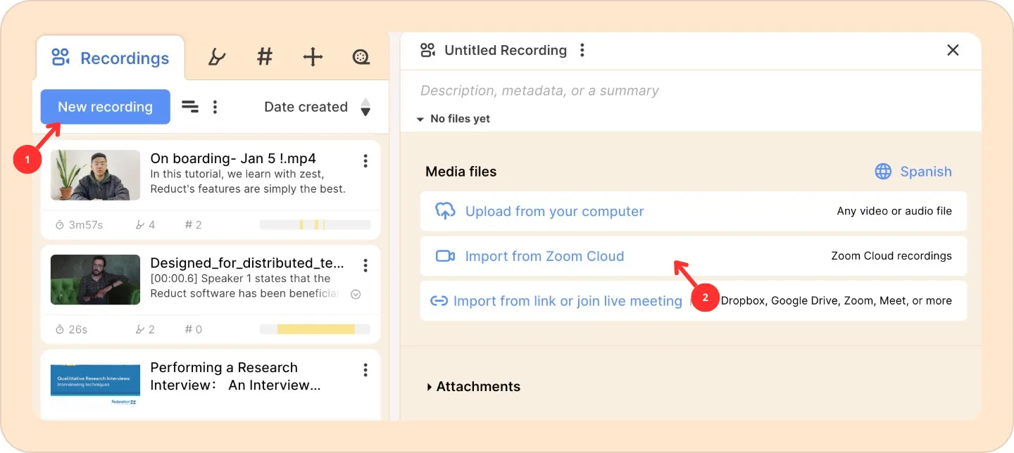 - Select Import from Zoom Cloud. Your Zoom admin will need to authorize the Reduct-Zoom integration (details here). This is often someone in your IT department.