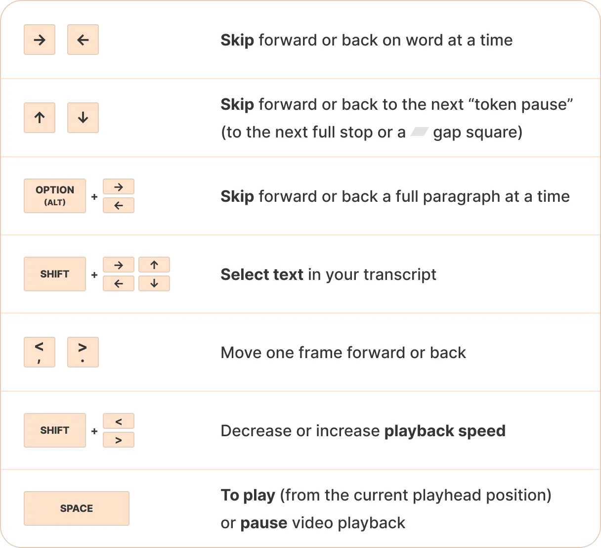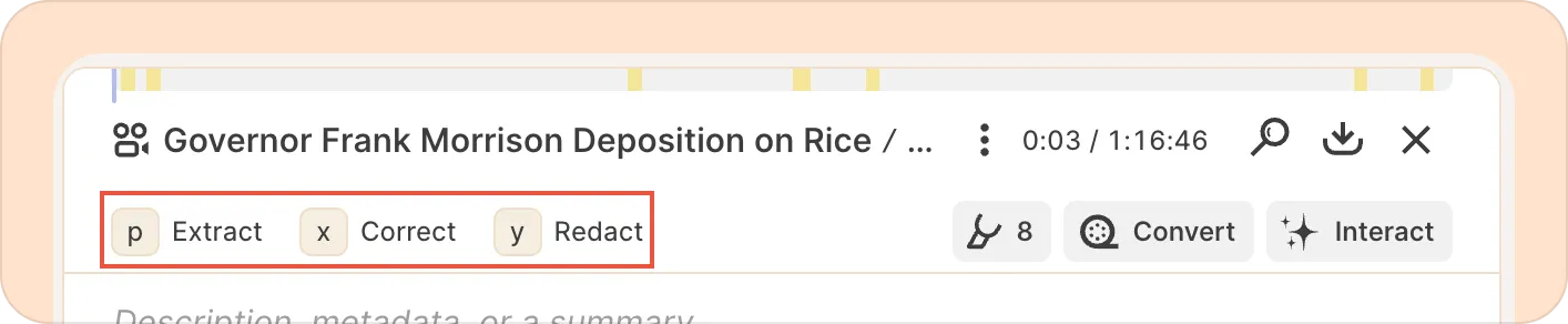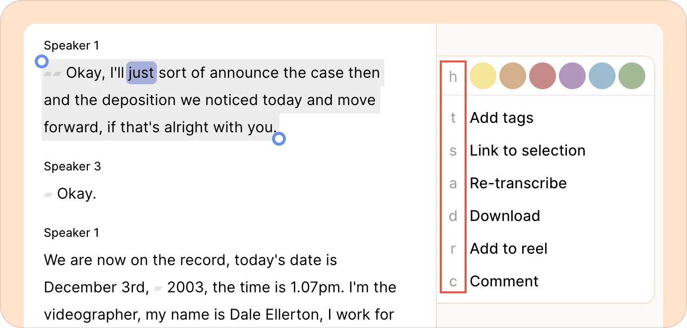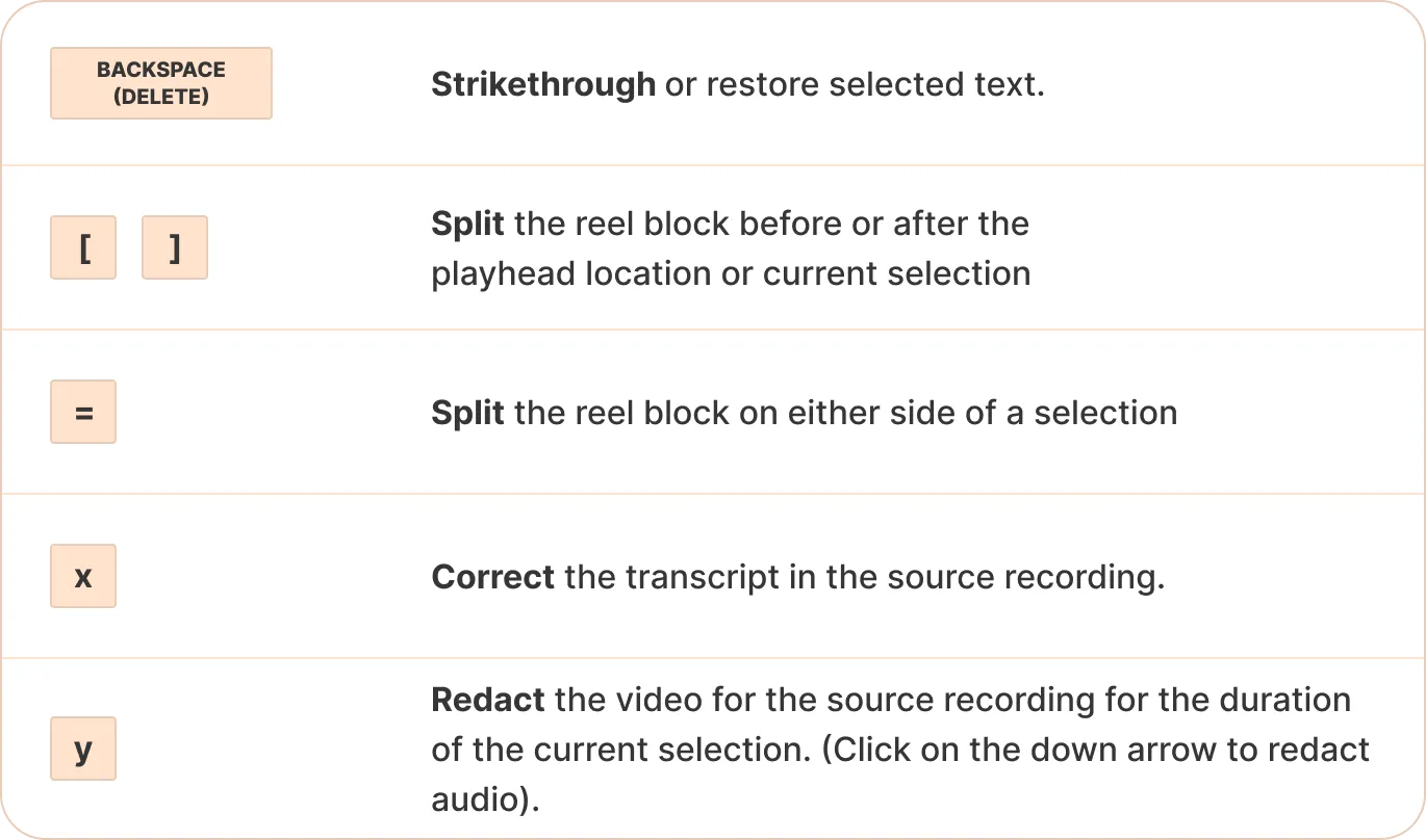 You can use keyboard shortcuts to quickly review, highlight, and tag transcripts, and to edit reels even more quickly.
