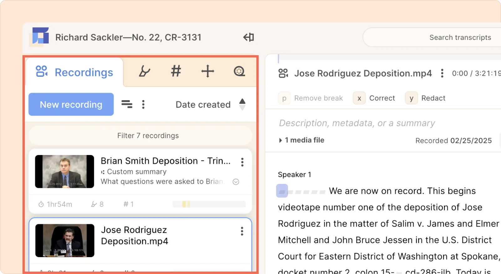 This is where you’ll find all your uploaded audio and video files, along with their full transcripts. You can also upload new media directly from this tab.