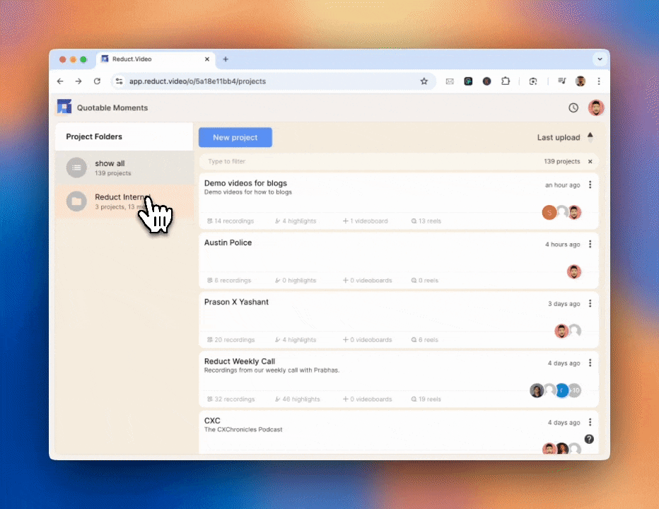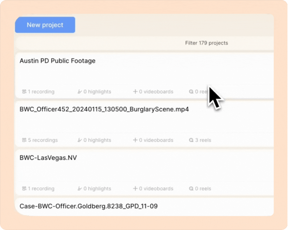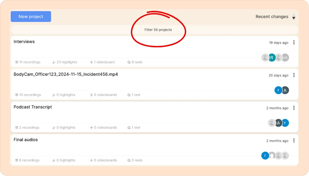 The quick filter can also help you find specific recordings or reels within projects, and looks through the title and description of items.