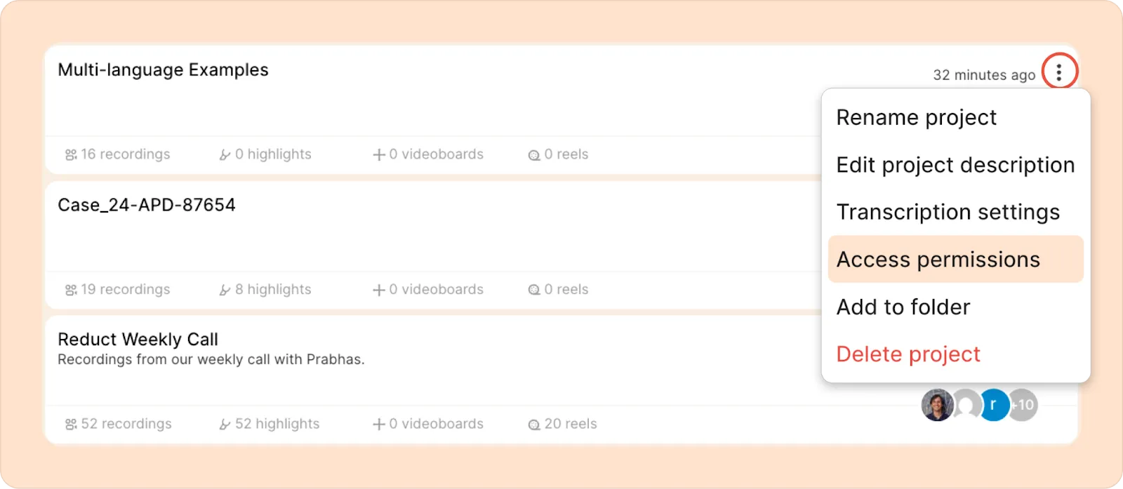 - Click the three-dot kebab (︙) menu next to the project and select Access permissions.