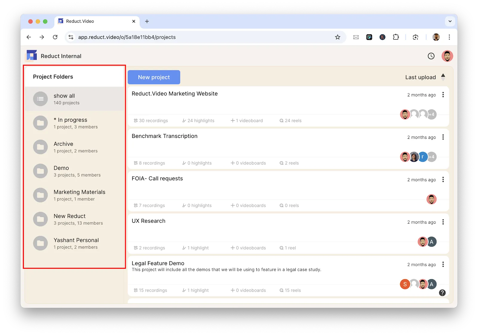 Projects in Reduct can act as permission boundaries - ie, you can control which users have access to a given project. In the project listing page, you’ll see profile pictures next to each project, on the right. These represent users who are currently members of that project; hover over them to see more details. As an editor, you can add or remove members and decide who can view or edit your project.