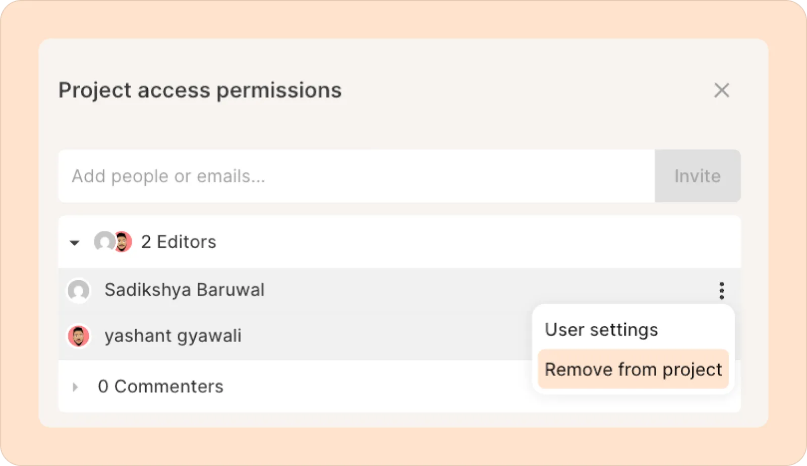 - To remove someone, click the kebab (︙) menu next to their name and choose Remove from project.