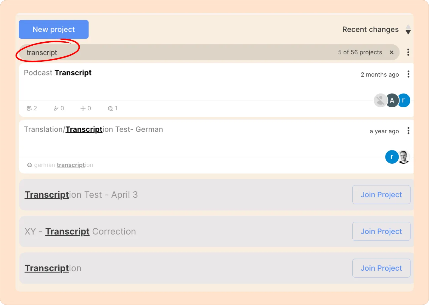 This allows you to narrow down the project list by title and keywords in the description, making it easier to access the project you need without scrolling through everything.