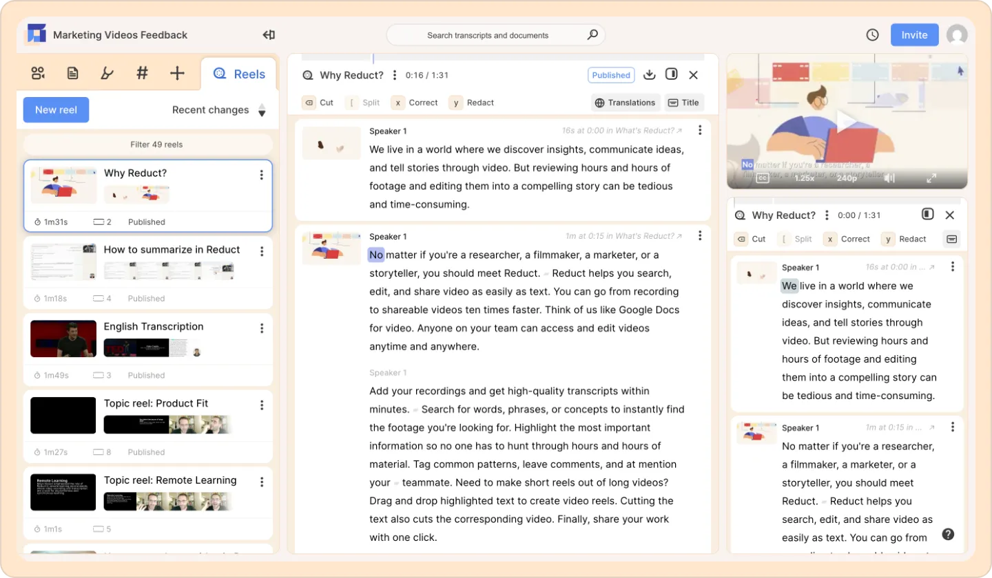 Pinned reels let you have a recording, your highlights, or another reel in the central panel, at the same time as having a reel visible on the right side of your screen. You can drag items to the pinned reel, and drag to rearrange, just as you can with a reel in your central panel.