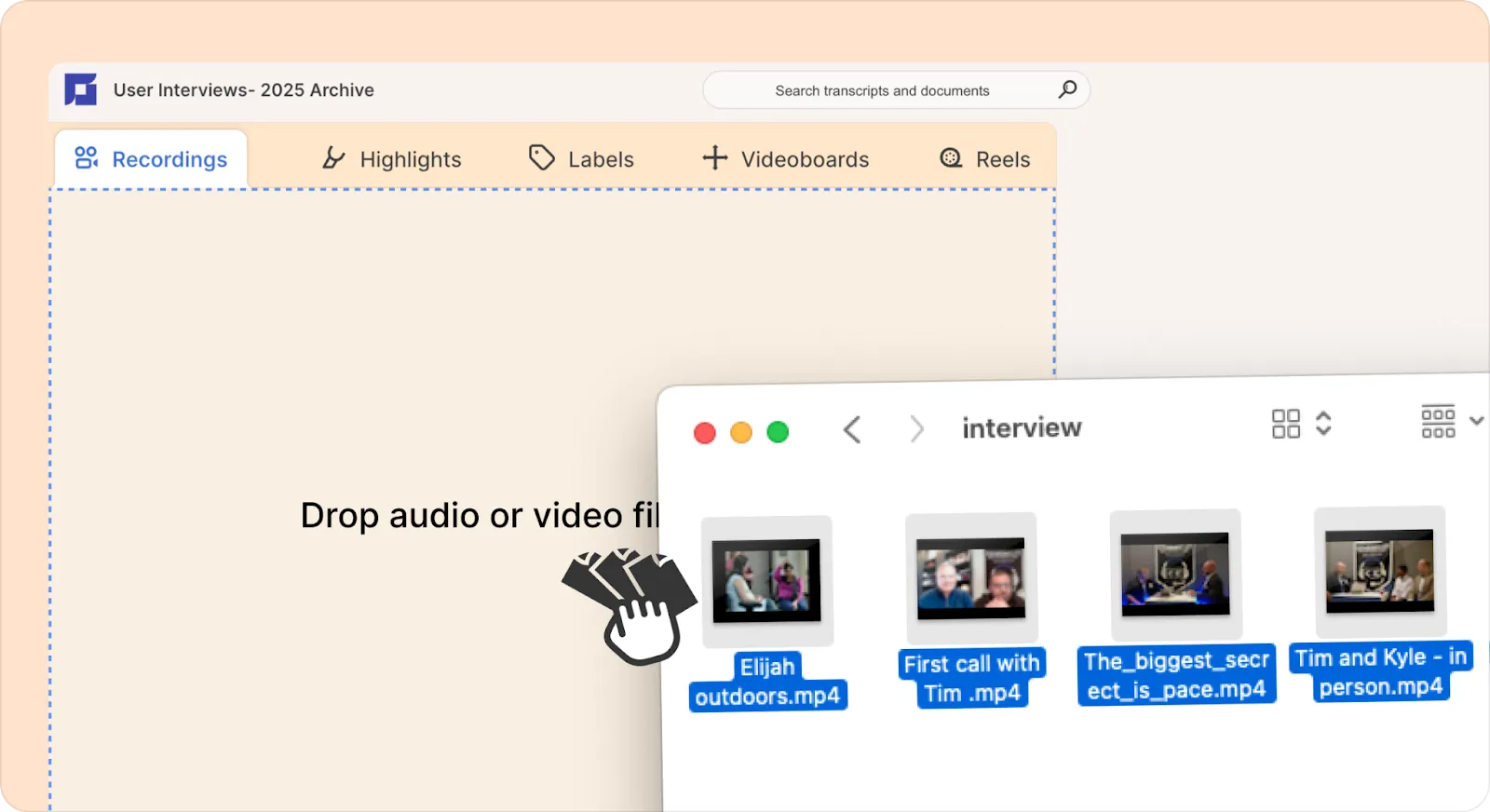 You can upload your recordings in bulk with a simple drag and drop. Just open your folder, select the files that you want to upload and drag and drop them onto the left-hand side panel (sidebar) in Reduct.