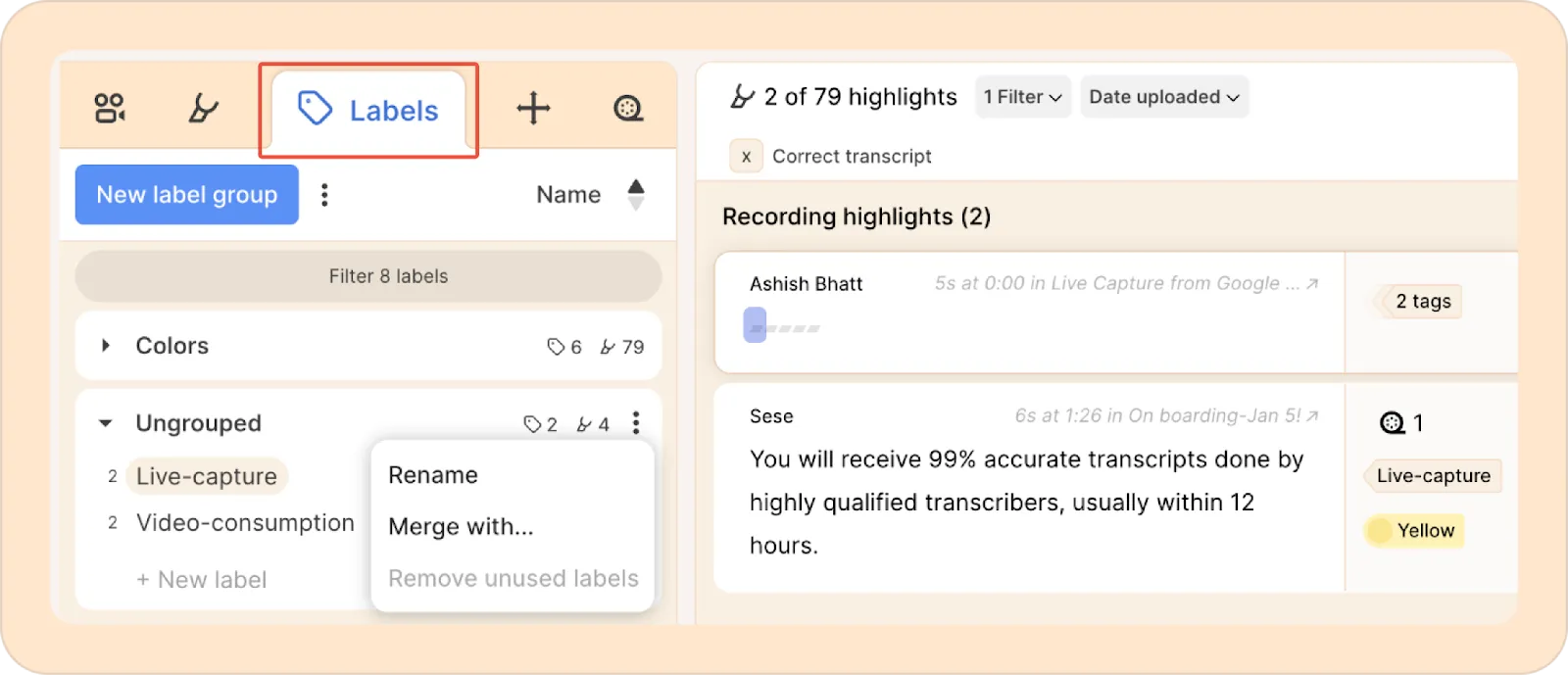If you switch the left sidebar to Labels, you’ll see all the labels currently in your project. From there, you can manage them: rename, group, merge, and more.