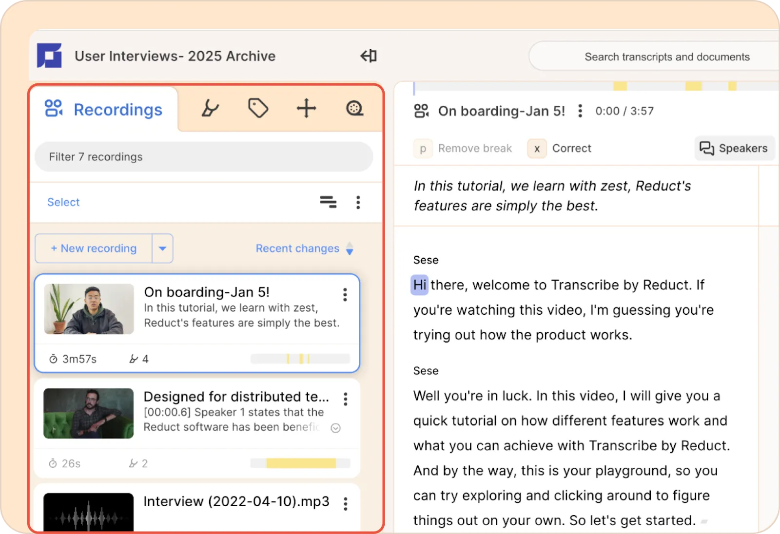 Click on any search result to jump to that specific part of the recording's transcript, with the text from your search selected so that you can take action (such as highlight, label, or add to a reel).