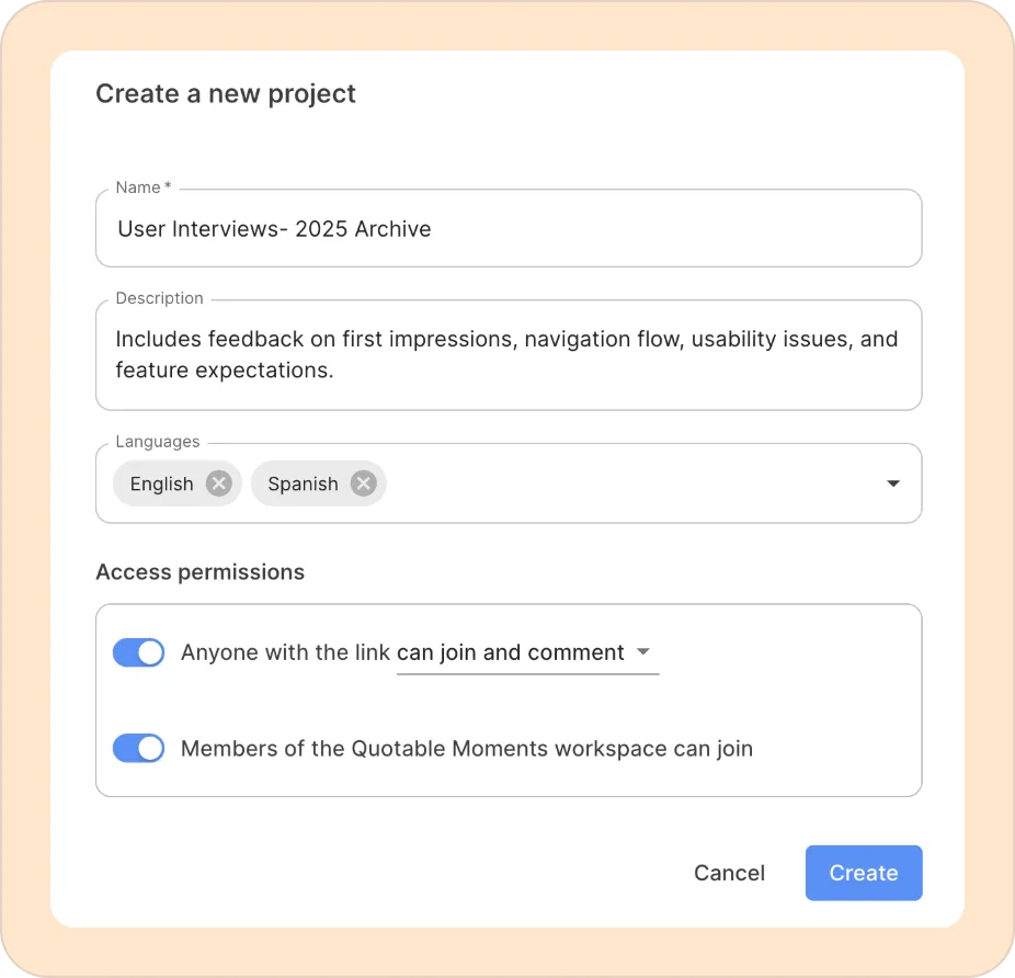 If you're setting up a new project, give your project a name and a description, select your default transcription language, and set appropriate access permissions. You can adjust these settings at any time.