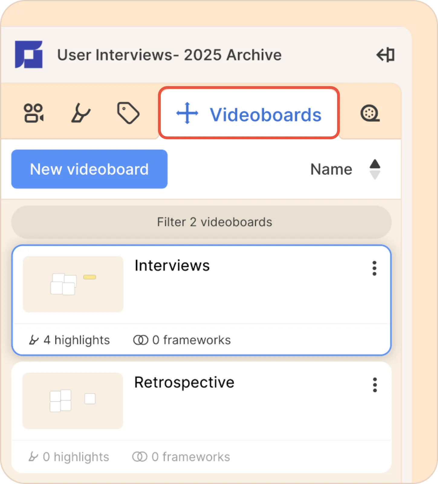 If your project demands more nuanced analysis, synthesis, or narrative flow than you can keep track of mentally, you can bring your highlights into a videoboard, where you can think and collaborate spatially.