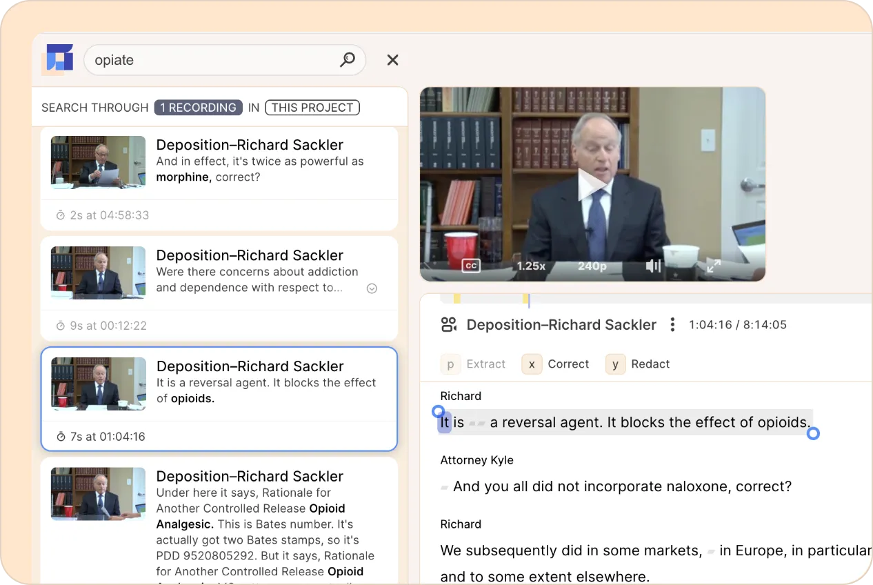 In Reduct, the AI-generated transcript is precisely synced to your video or audio, word for word, syllable by syllable, down to the millisecond. You can also click on any word in the transcript to instantly jump to that exact moment in the video, eliminating the need to scrub through hours of footage. With this approach, you save a lot of time during review.