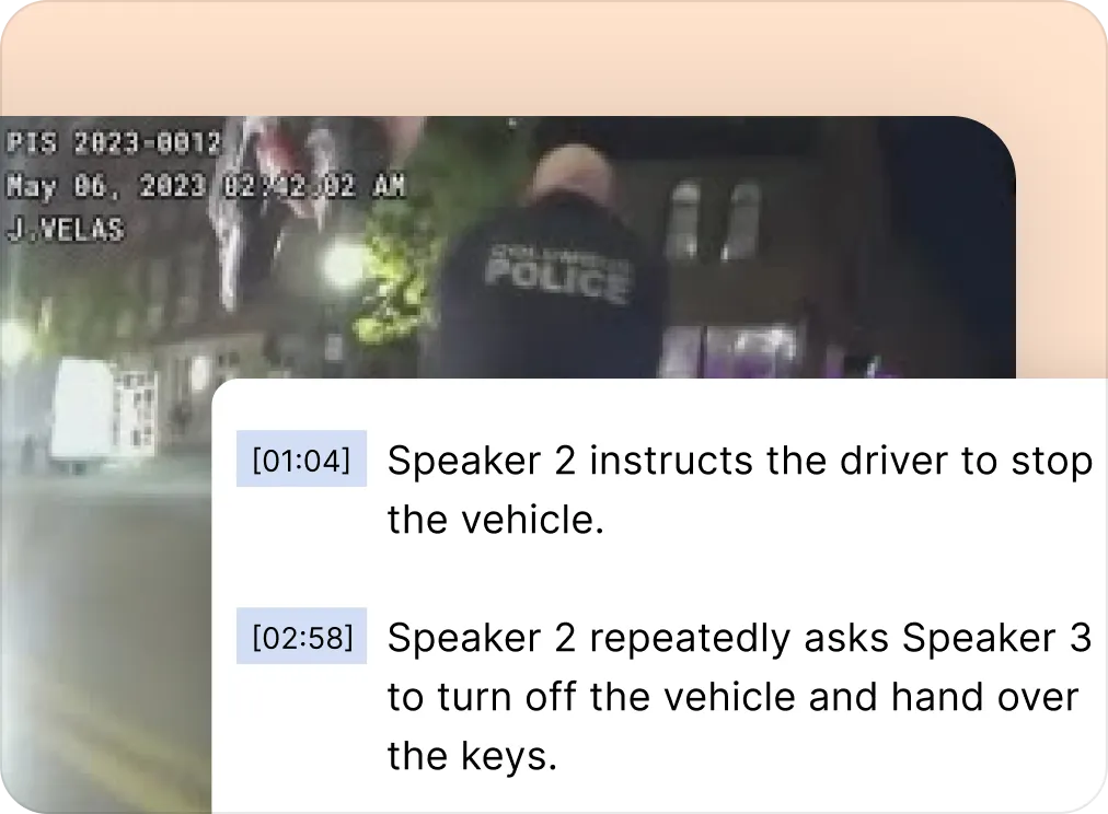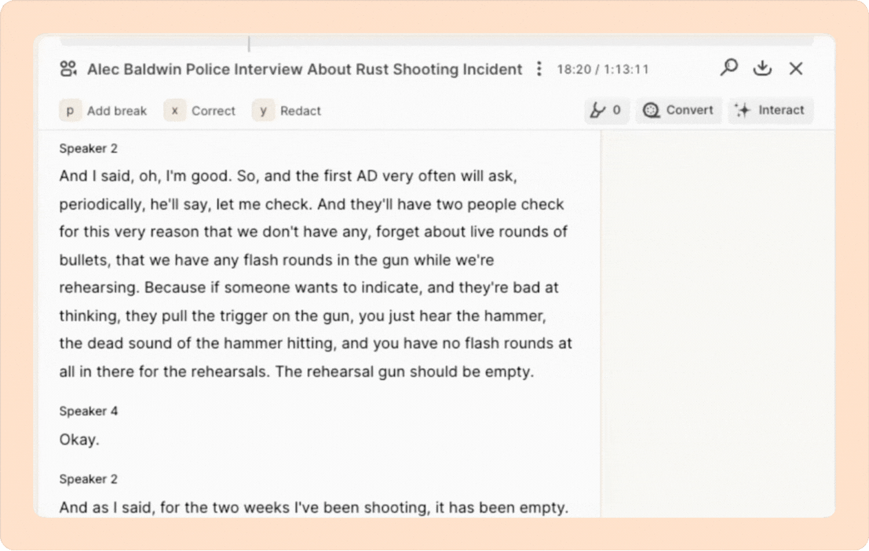 In Reduct, the AI-generated transcript is precisely synced to your video or audio, word for word, syllable by syllable, down to the millisecond. You can also click on any word in the transcript to instantly jump to that exact moment in the video, eliminating the need to scrub through hours of footage. With this approach, you save a lot of time during review.