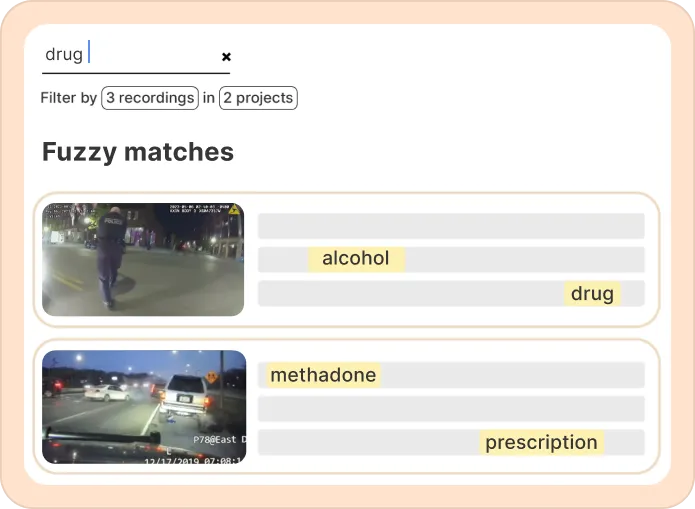 Our search will show the exact matches for the term you put in followed by fuzzy search. You can click on any search result to jump to that exact moment in a recording's transcript to review.