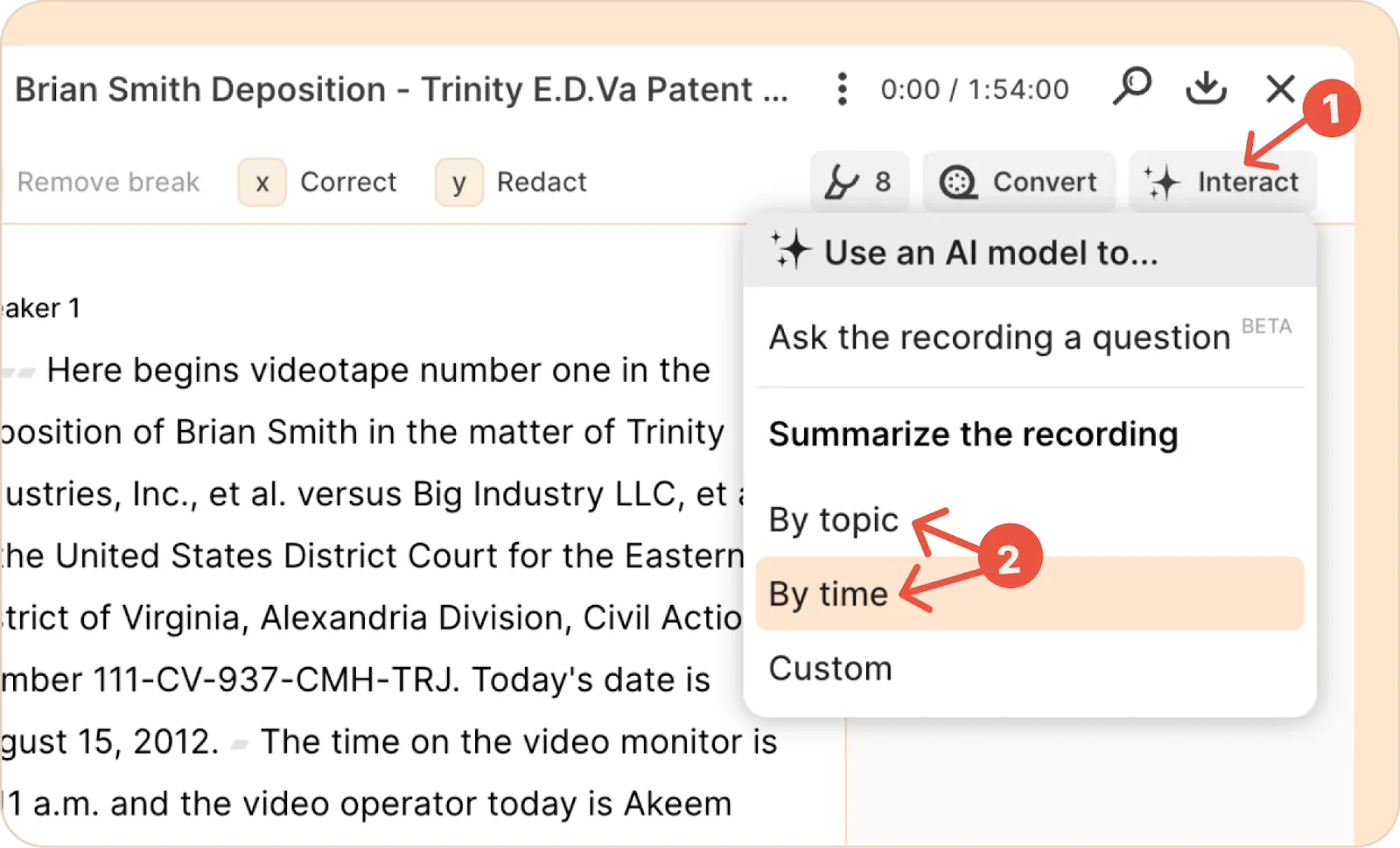 Reduct also offers the ability to generate a summary of the recording using AI — just click on the Interact button at the top of the recording and select your preferred summary type.