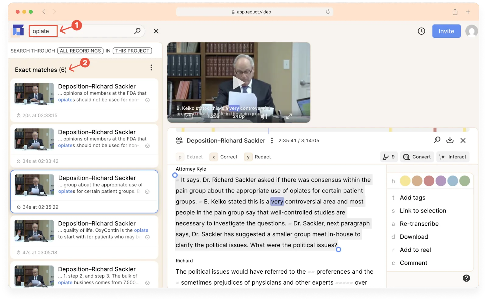 With Reduct, you can export court-formatted transcripts and video exhibits, ready to present at trial.