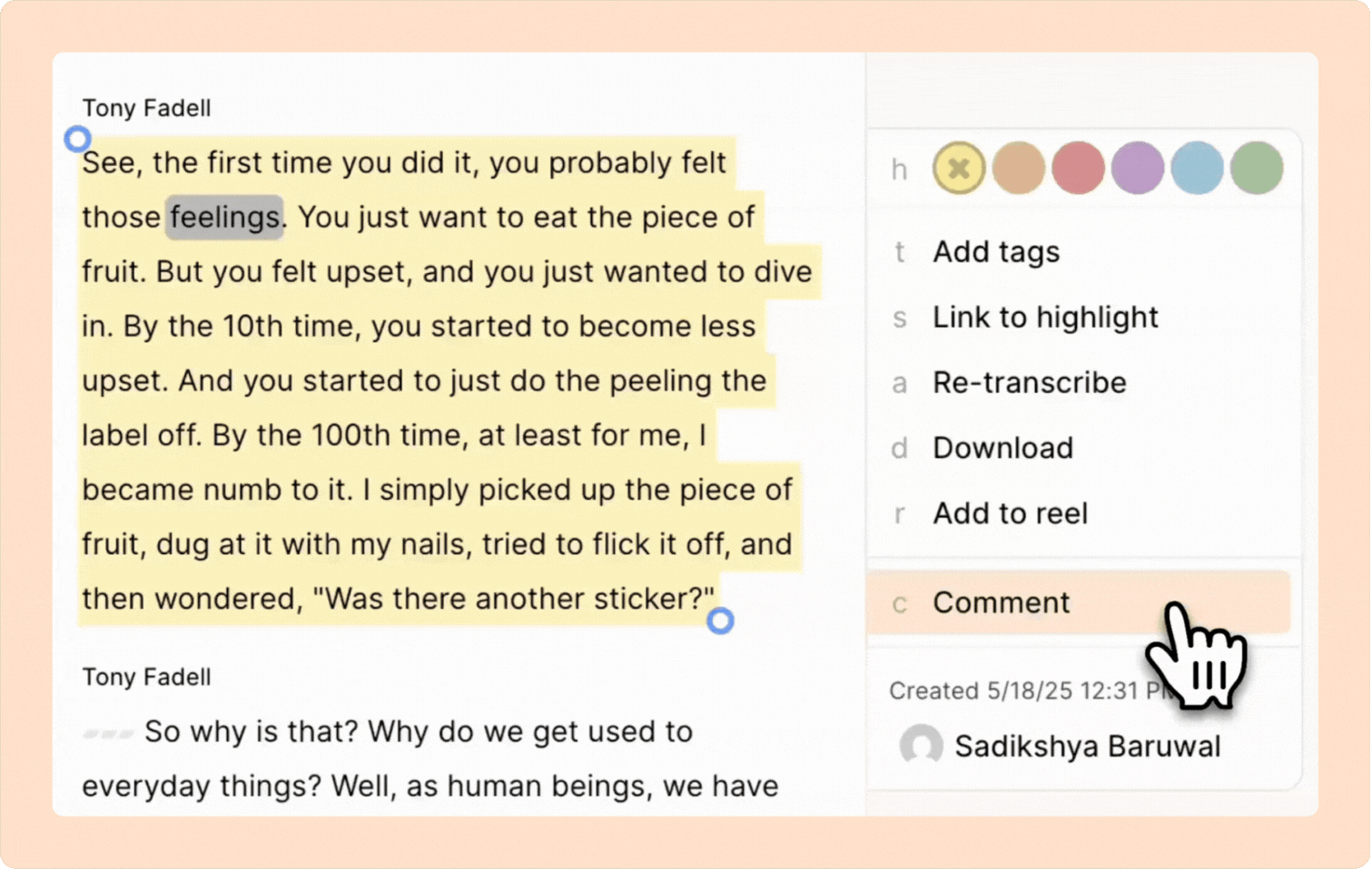 You can add comments directly to the transcript to annotate specific sections.