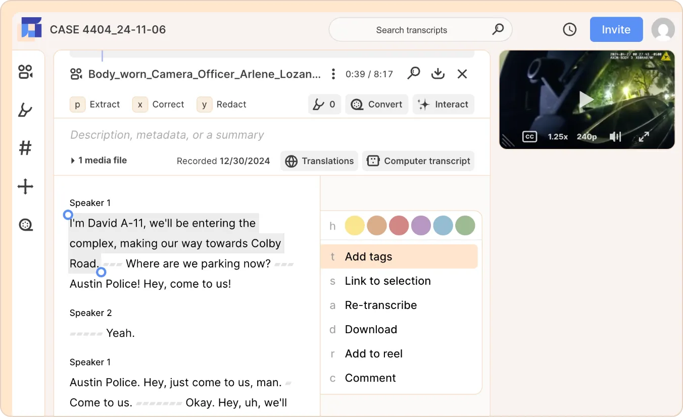 Reduct is designed to help you identify irrelevant discovery and find relevant evidence from 100s of hours of video and audio footage.