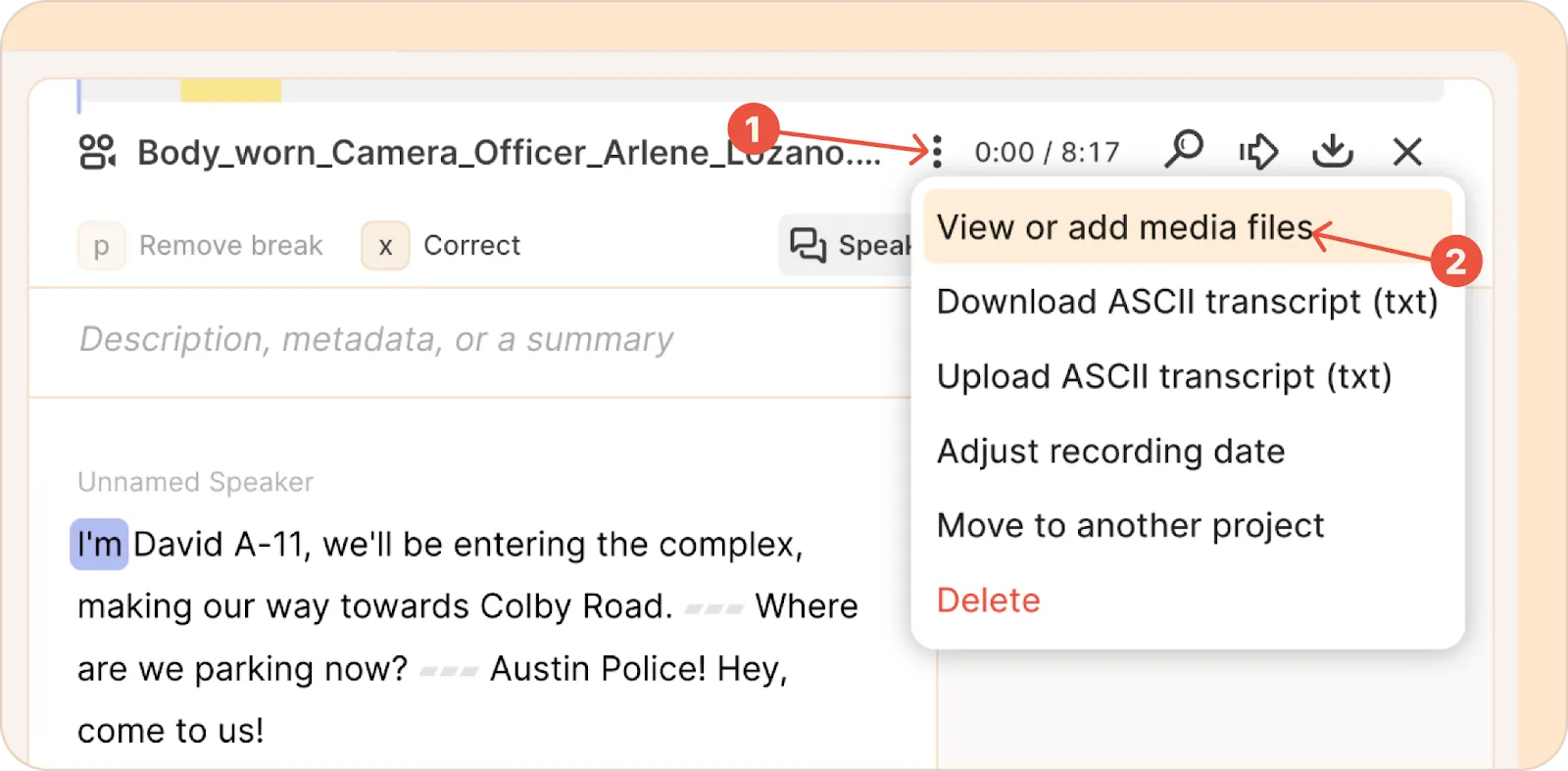 Attachments are not processed or transcribed by Reduct. You can download or delete an attachment by expanding the attachment and clicking the three-dot kebab (︙) menu to the right of each file.