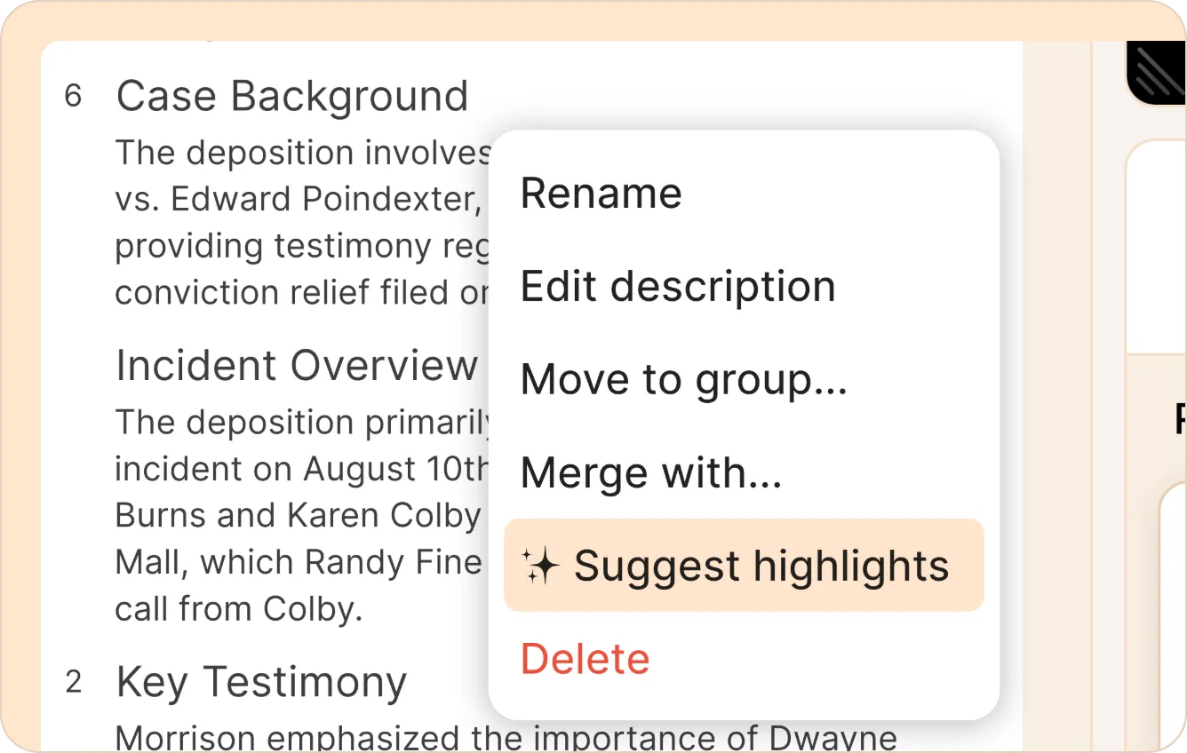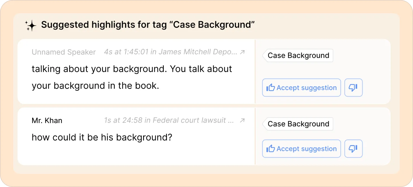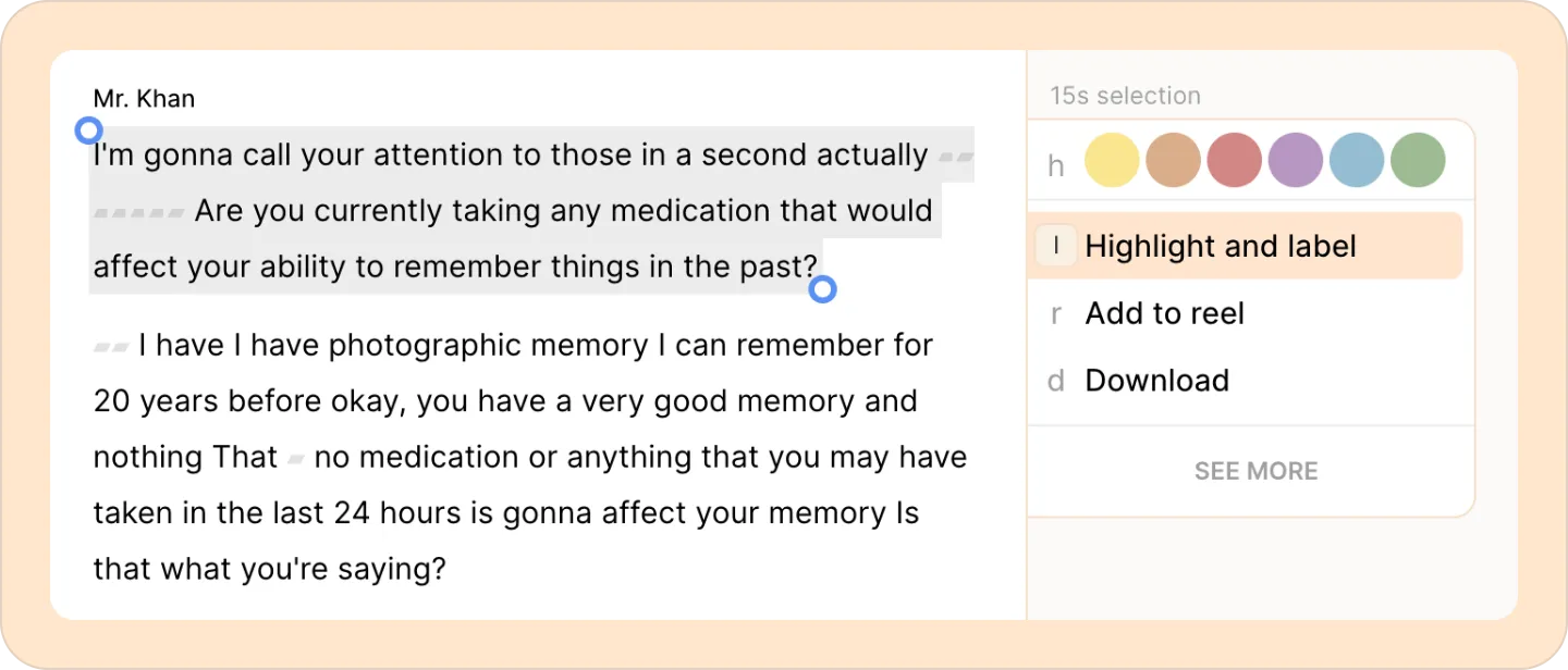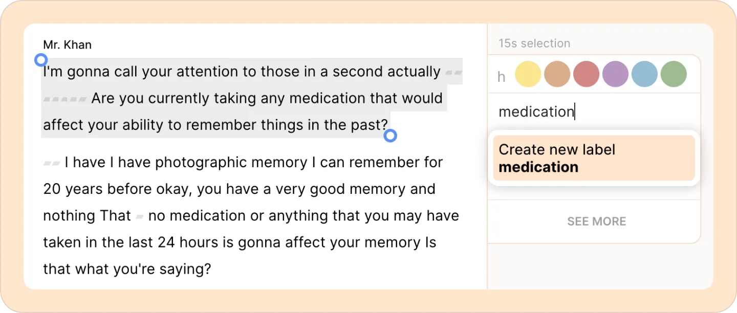 Use our Suggest highlights feature to automatically identify other parts of the transcript relevant to the specific label and easily add them.