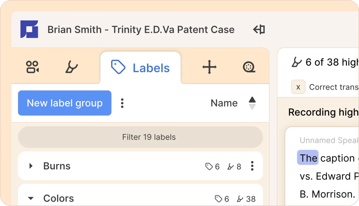 - Select the part of the transcript you want to add a label to, or click on an existing highlight.