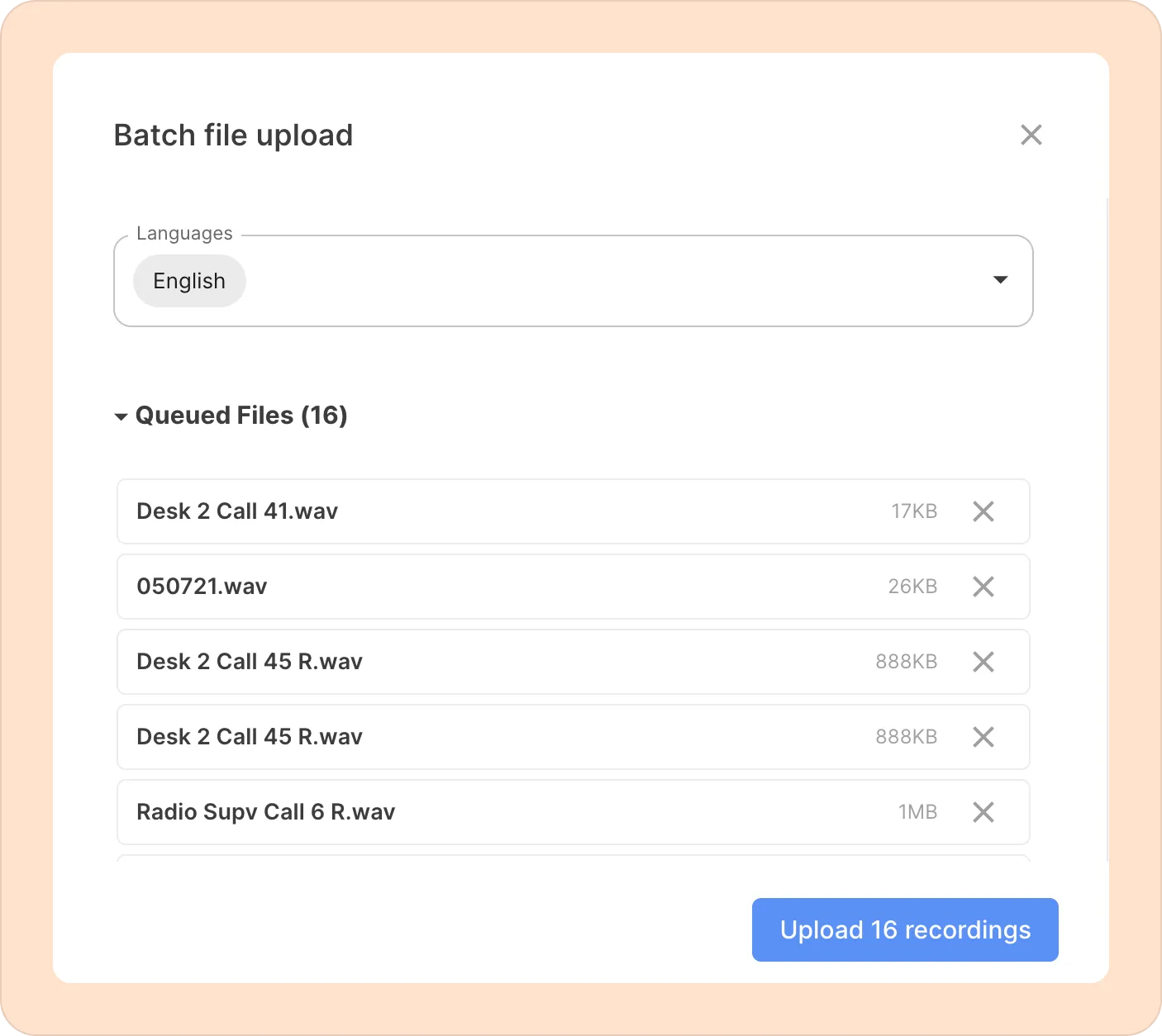 - You will now see a pop-up with all your selected files in a queue. Select the language your files are in and click on the Upload button.