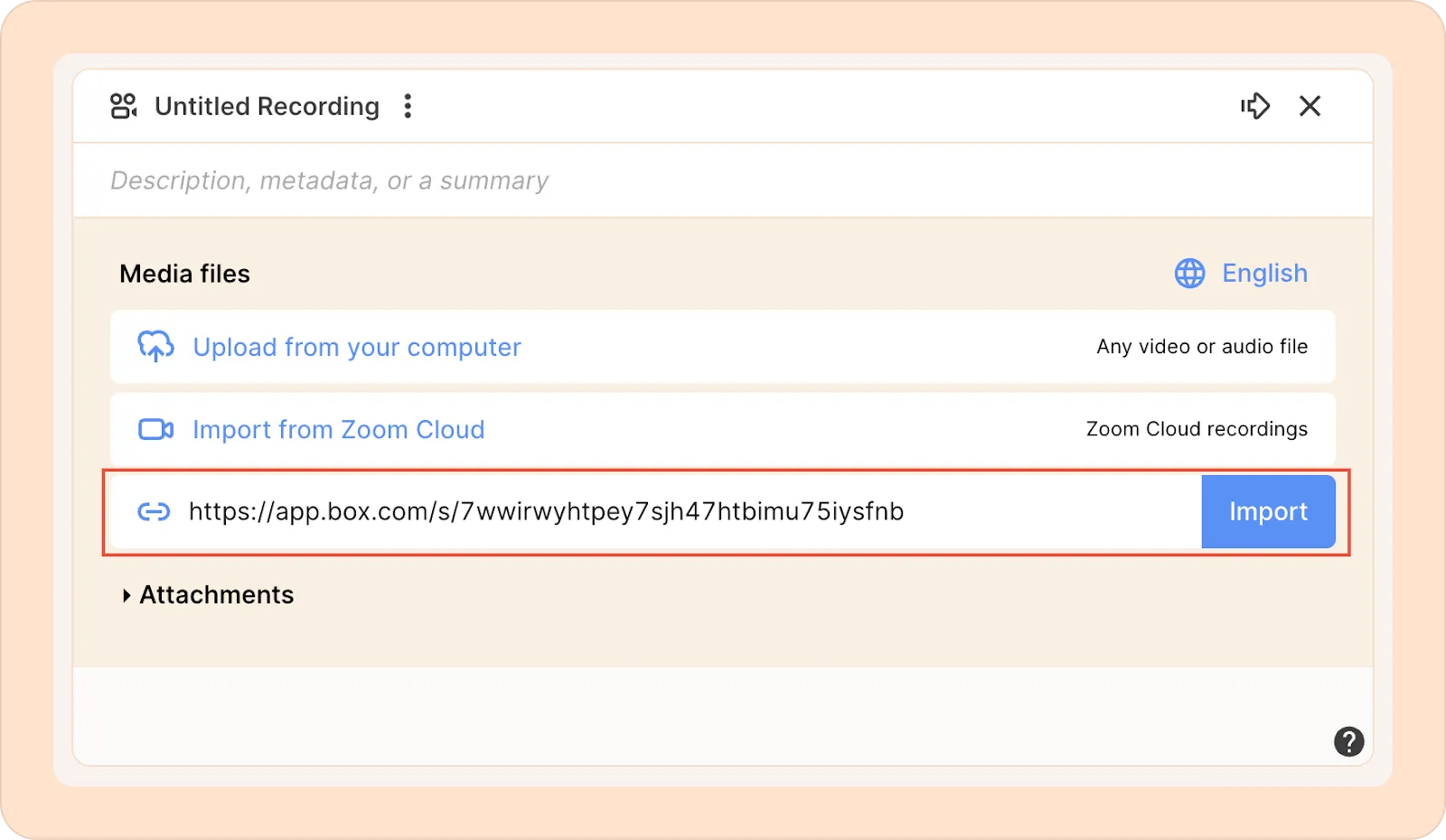 - Paste the publicly accessible URL and click Import. This can be a link to a media file that you have access to (eg, hosted on Google Drive or Dropbox) or a live call (such as Zoom, Meet, or Teams)