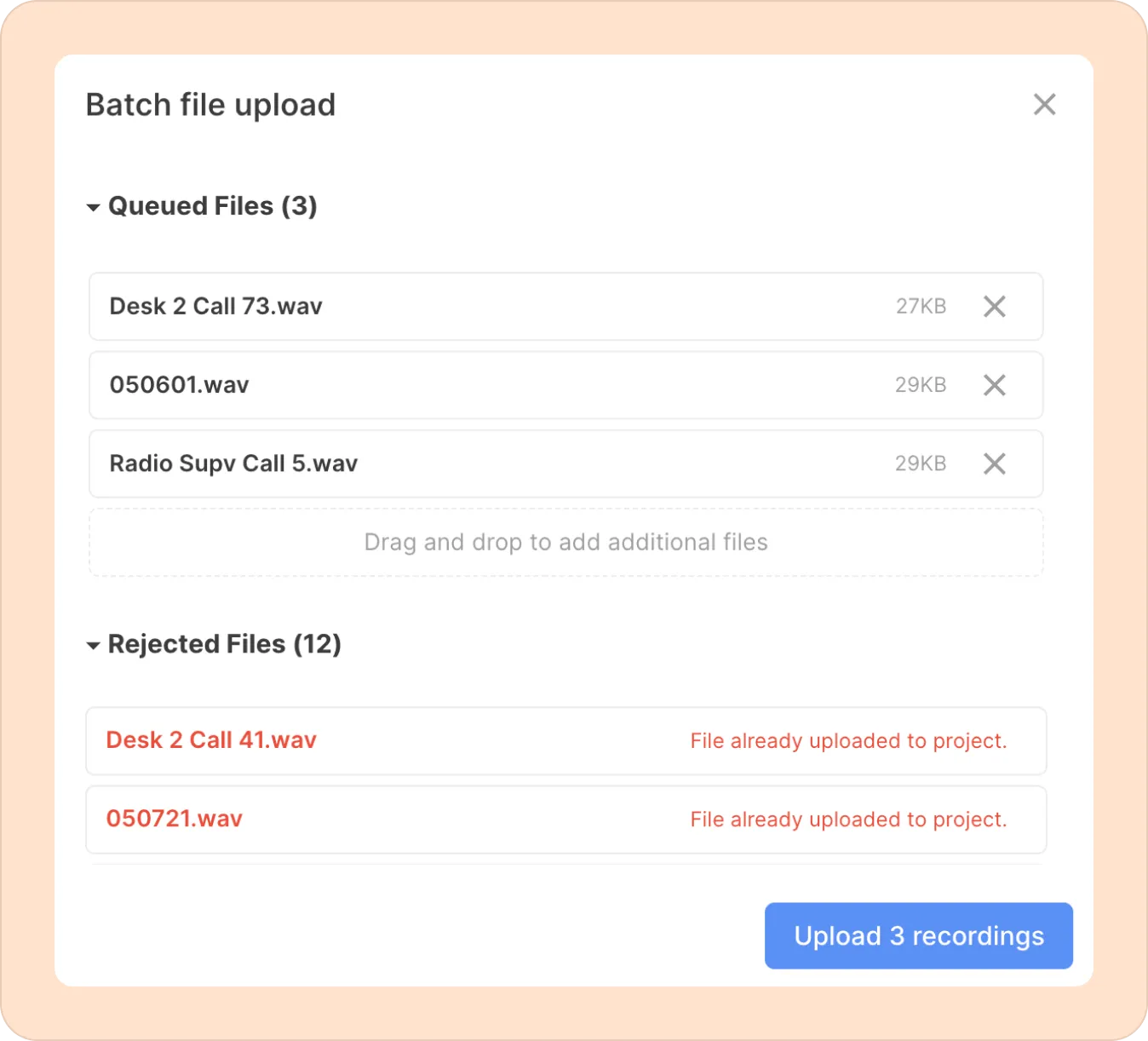 If you would prefer to upload recordings one at a time, you can use a different approach.