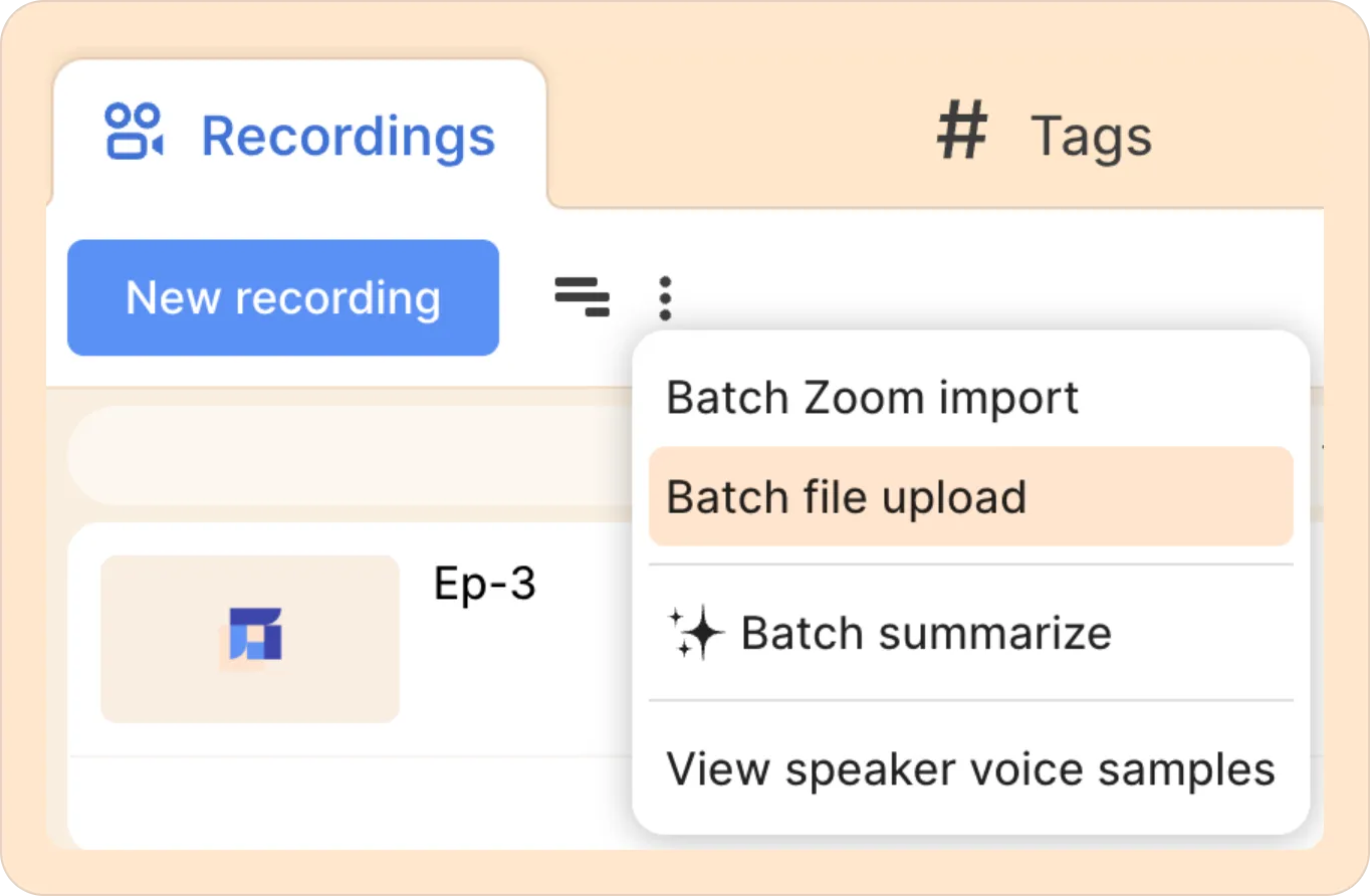 The simplest way to upload a file is to drag-and-drop one or more files from your computer straight into the “Recordings” panel on the left of your screen.