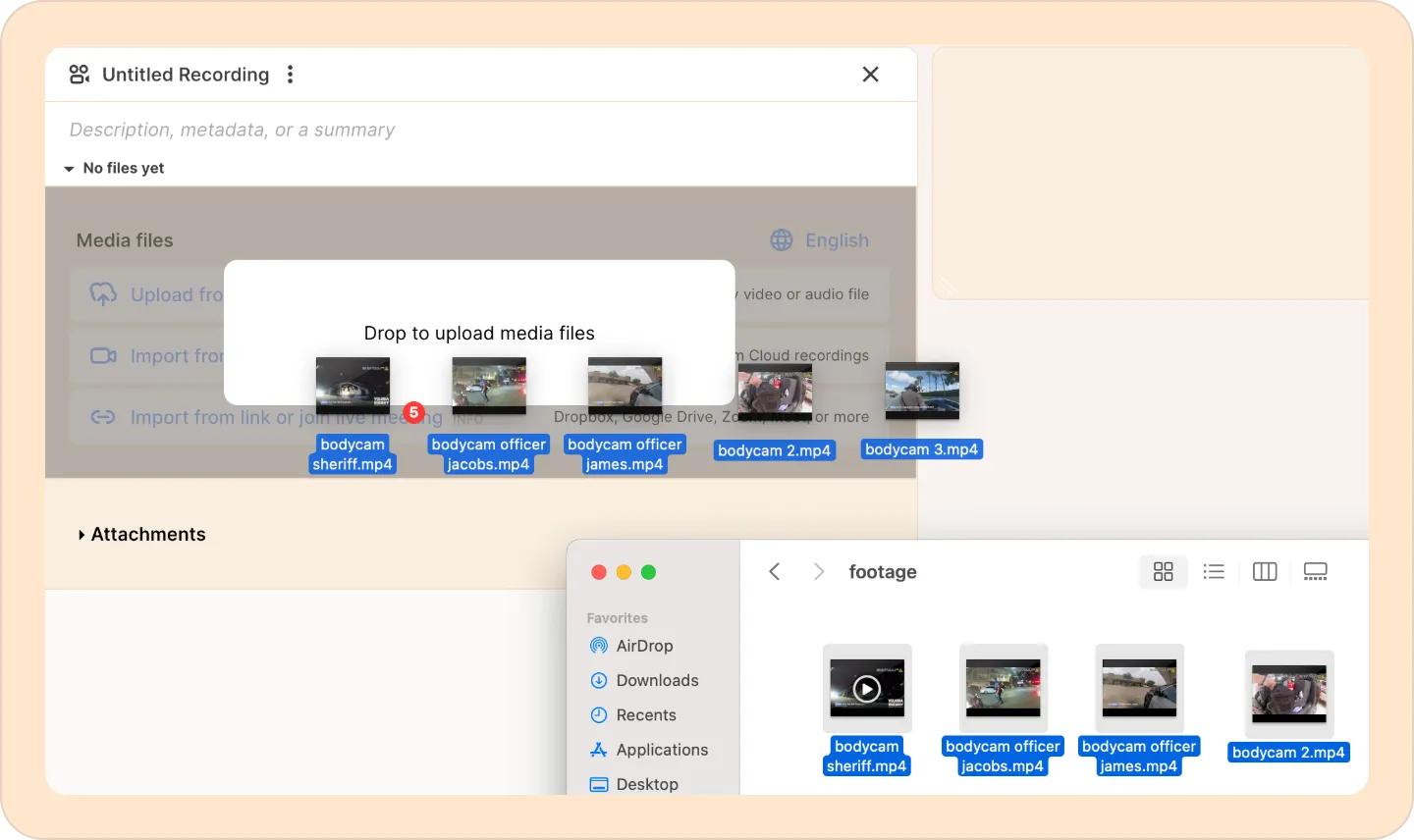 - Next, from your computer, select the audio/video files that you want to upload and drag and drop them into Reduct.