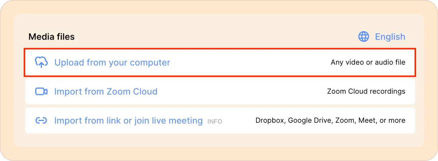 - Now, click on English to set the language spoken in the recording; you can choose from over 90 languages. If you don’t want to change the language, you can skip this step.